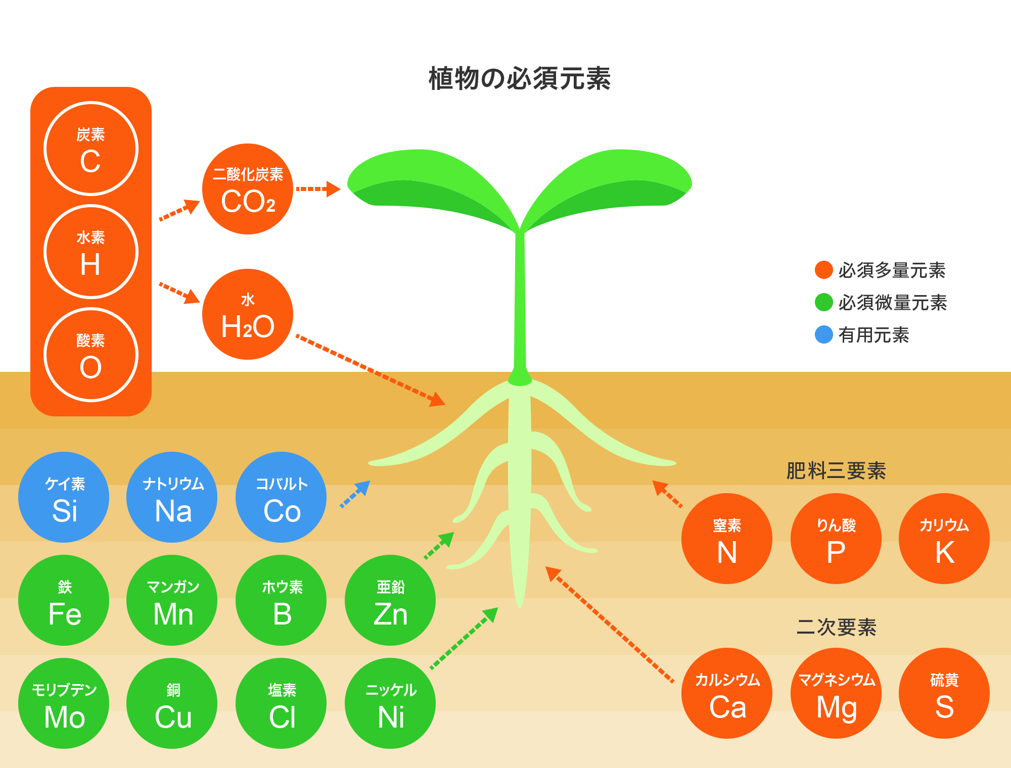 窒素(N)、リン酸(P)、カリウム(K)、酸素(O)、水素(H)、炭素(C)カルシウム(Ca)、マグネシウム(Mg)、硫黄(S)、鉄(Fe)、マンガン(Mn)、ほう素(B)、亜鉛(Zn)、モリブデン(Mo)、銅(Cu)、塩素(Cl) 、ニッケル(Ni)