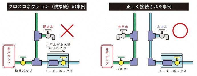 水道の給水管と水道以外の管が接続されていると、バルブの故障や操作不良、閉め忘れなどにより井戸水等が配水管(水道本管)に逆流するおそれがあります。逆流した水が汚染されていた場合、周辺の水道水が汚染されるなど、公衆衛生上大きな被害を引き起こすことになります。