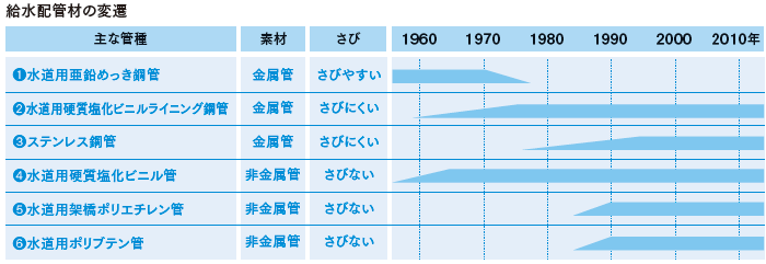 技術革新により「ステンレス鋼管」と「ポリエチレン管」が発明された結果、鉄さび問題に終止符が打たれました。 鉄管が使われなくなったことで錆こぶもなくなり、出てくる水もきれいになった。