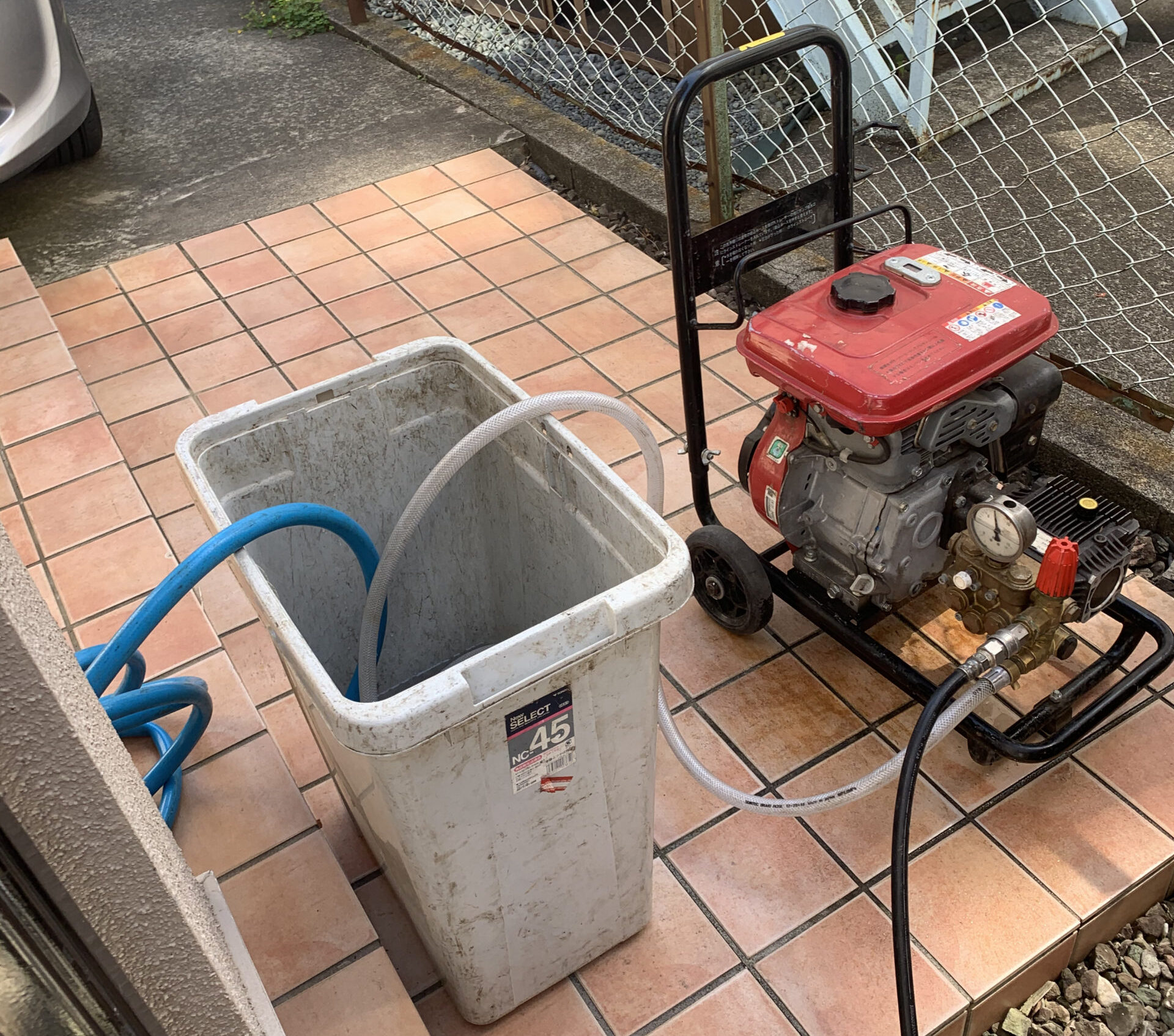 当社で使用している高圧洗浄機は、電動式ではなく、業務用のガソリン駆動の高圧洗浄機です。