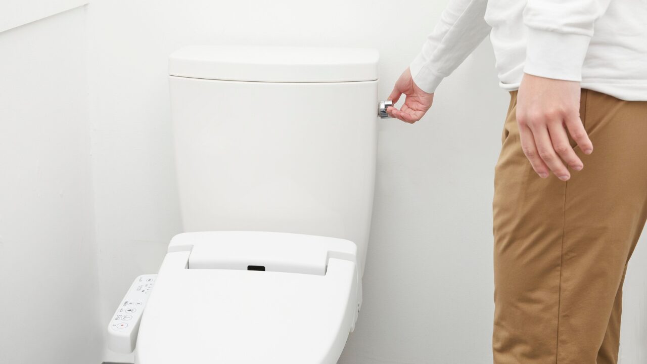 まず、トイレの奥にある止水栓を閉めて、水が出ないようにします。