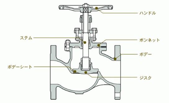 ボディが丸みを帯びているので「玉形弁」「グローブ弁」(globeは球体という意味です)と呼ばれています。中を通る液体や気体(これを流体といいます)の流量を調整するに優れているのと同時に、流体の流れをきっちり止める性能も高いため「ストップバルブ」と呼ばれることもあります。